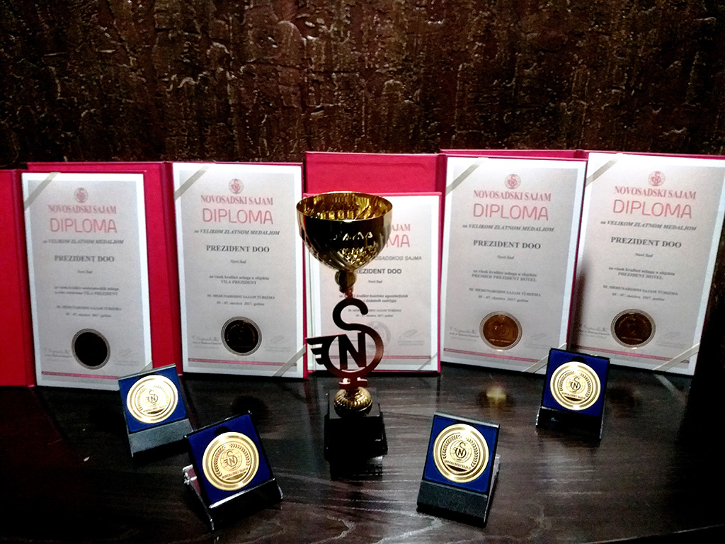 Na svečanoj dodeli priznanja Novosadskog Sajma u četvrtak 05. oktobra 2017. godine, Prezident Hoteli su još jednom potvrdili svoj status kao najbolji nacionalni lanac Hotela u regionu i tom prilikom osvojili 4 velike zlatne medalje i šampionski pehar Novosadskog Sajma za najviši kvalitet hotelsko ugostiteljskih usluga i dodatnih sadržaja. Želimo svima da se zahvalimo na ukazanom poverenju i obećavamo da ćemo i u budućnosti zadržati visok kvalitet usluge i da ćemo nastaviti da postavljamo visoke standarde.
